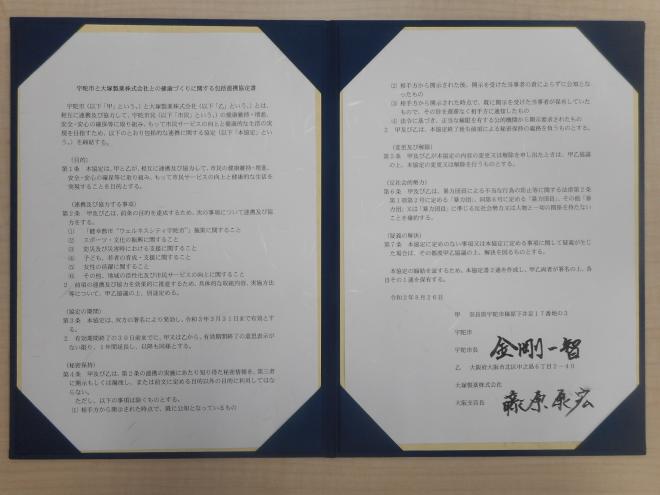 宇陀市と大塚製薬株式会社は、相互に連携及び協力して、宇陀市民(以下「市民」という。)の健康維持・増進、安全・安心の確保等に取り組み、もって市民サービスの向上と健康的な生活の実現を目指すことを目的に、令和2年8月26日に「健康づくりに関する包括連携協定」を締結しました。